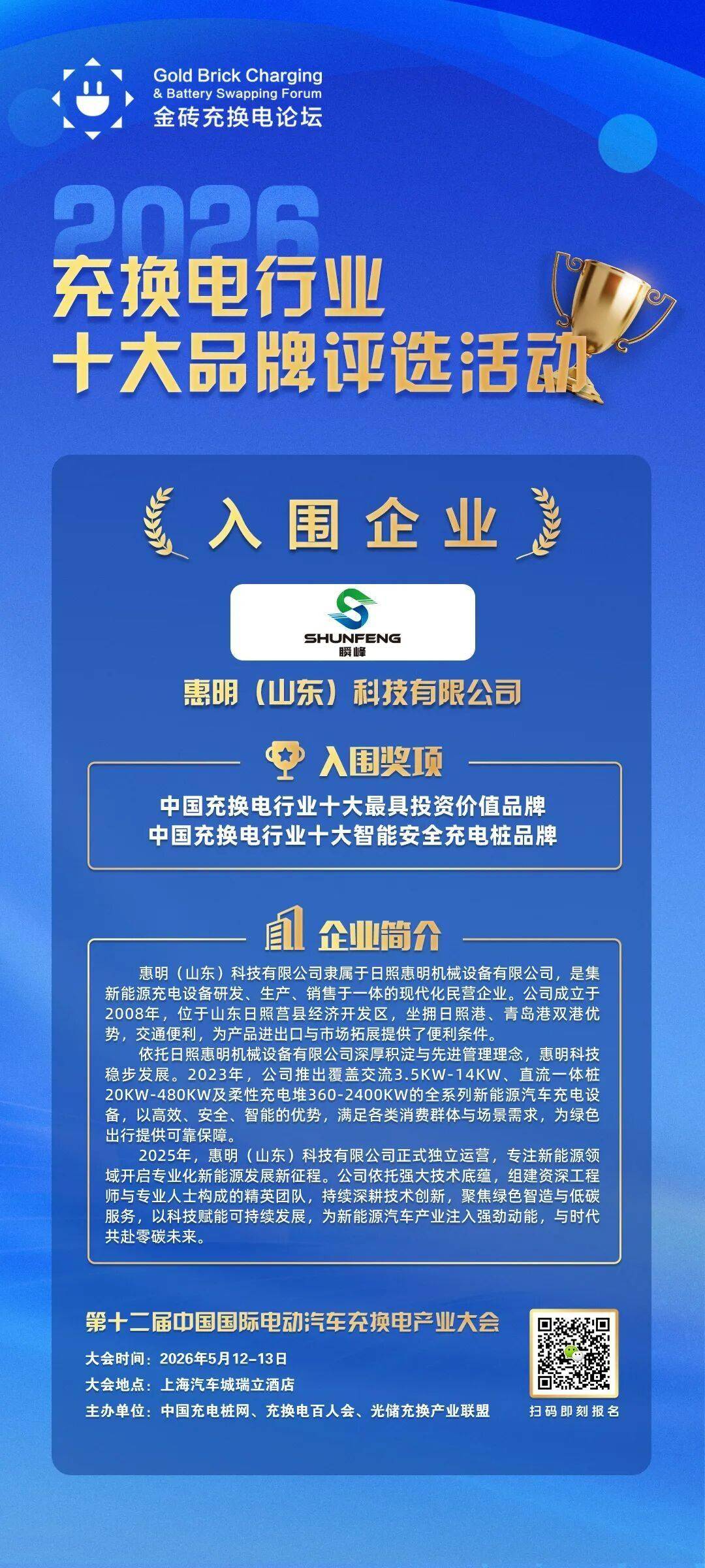 惠明(山东)科技无限公司做为行业优良企业之一,正在2026中国充换电行业十大品牌评选勾当中脱颖而出,成功入围2026中国充换电行业十大最具投资价值品牌、2026中国充换电行业十大智能平安充电桩品牌。