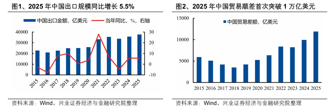 2025年正在复杂外手下,中国外贸持续超预期,展示出强劲韧性。2025年面临全球经济苏醒疲软以及关税摩擦升级等诸多晦气要素,中国出口总额来到汗青新高,同比增加5。5%。同期,同比大幅上升19。8%。